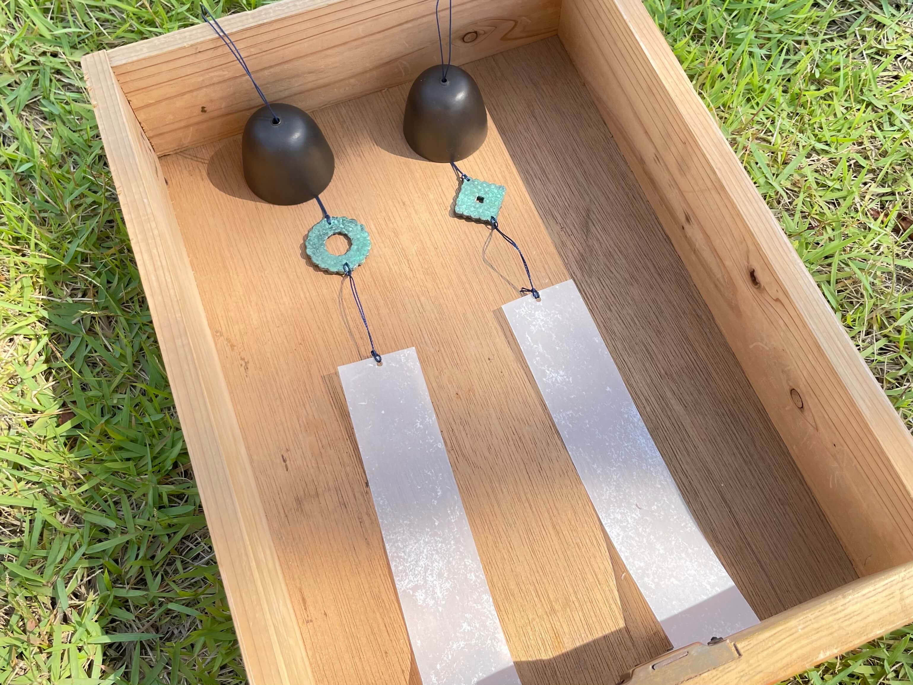 Solo Work 鋳物風鈴 はな/ダイヤ 分野 Metal Casting 制作年 2024年 素材 ブロンズ サイズ Φ50×H42mm(本体)全長約500mm 解説 柔らかいブラウンに緑青が映える、ブロンズ鋳物製の風鈴です。 チリン、と柔らかく高い音が鳴ります。 Artist Miku Mizuno -水野 美紅